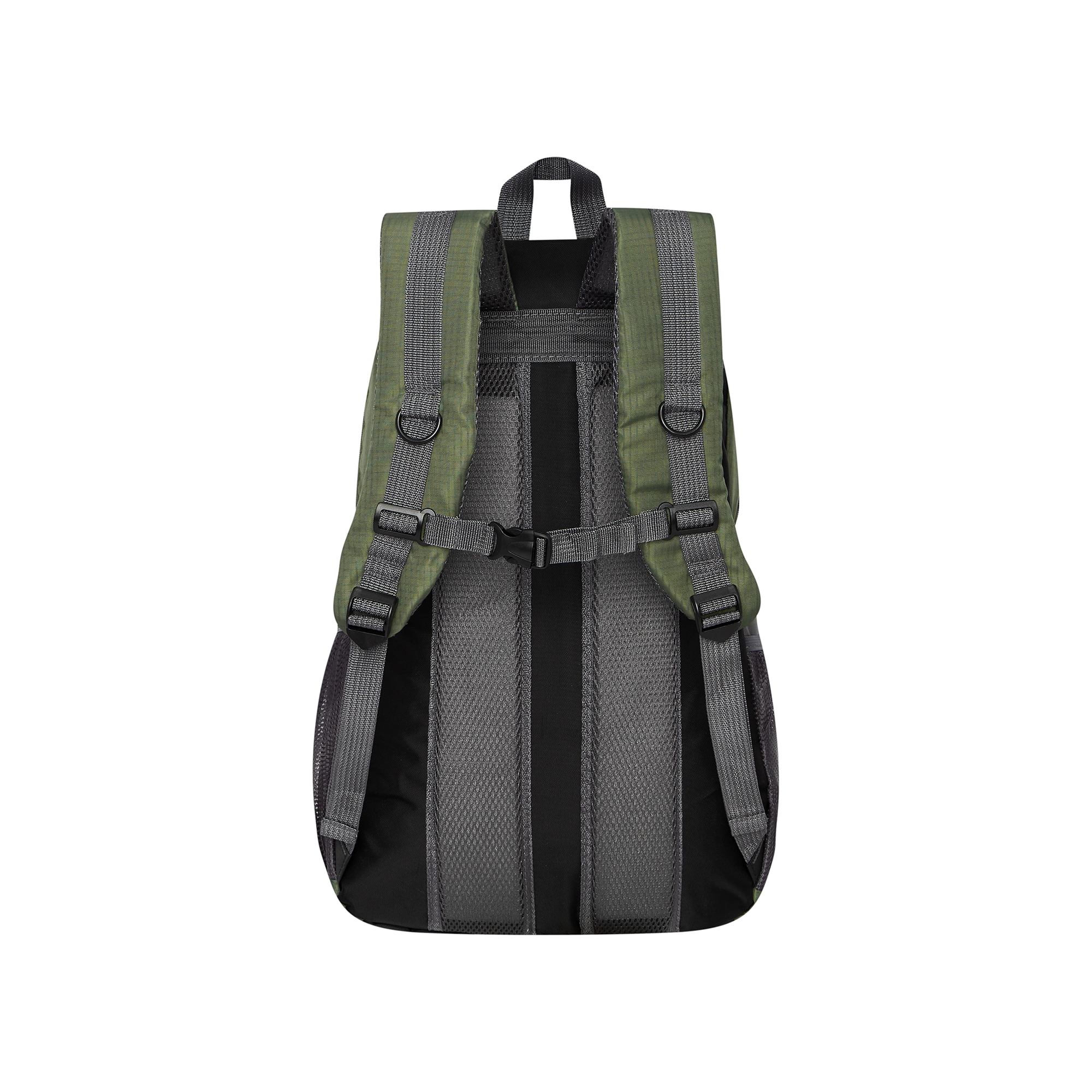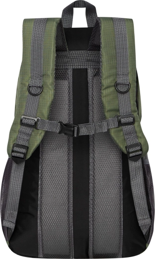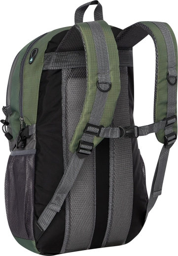 Fő rekesz elválasztóval, három cipzáras zseb, csattal zárható első zseb és két oldalsó hálós zseb palacknak vagy felszerelésnek.