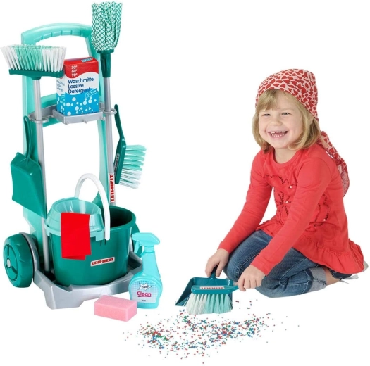 Stílusos, LEIFHEIT licenccel rendelkező gyermek takarítókocsi a KLEIN márkától, amely valósághű háztartási szerepjátékot kínál. A szett tartalmaz gurulós kocsit, vödröt csavaróval, felmosót, seprűt, kézi seprűt lapáttal és további kiegészítőket a valódi takarítás utánzásához. A könnyű anyagoknak és az átgondolt tartóknak köszönhetően minden könnyen kezelhető és azonnal játékra kész. Remek a motorika fejlesztésére, a felelősség tanulására és a kreatív szerepjátékra 3 éves kortól.