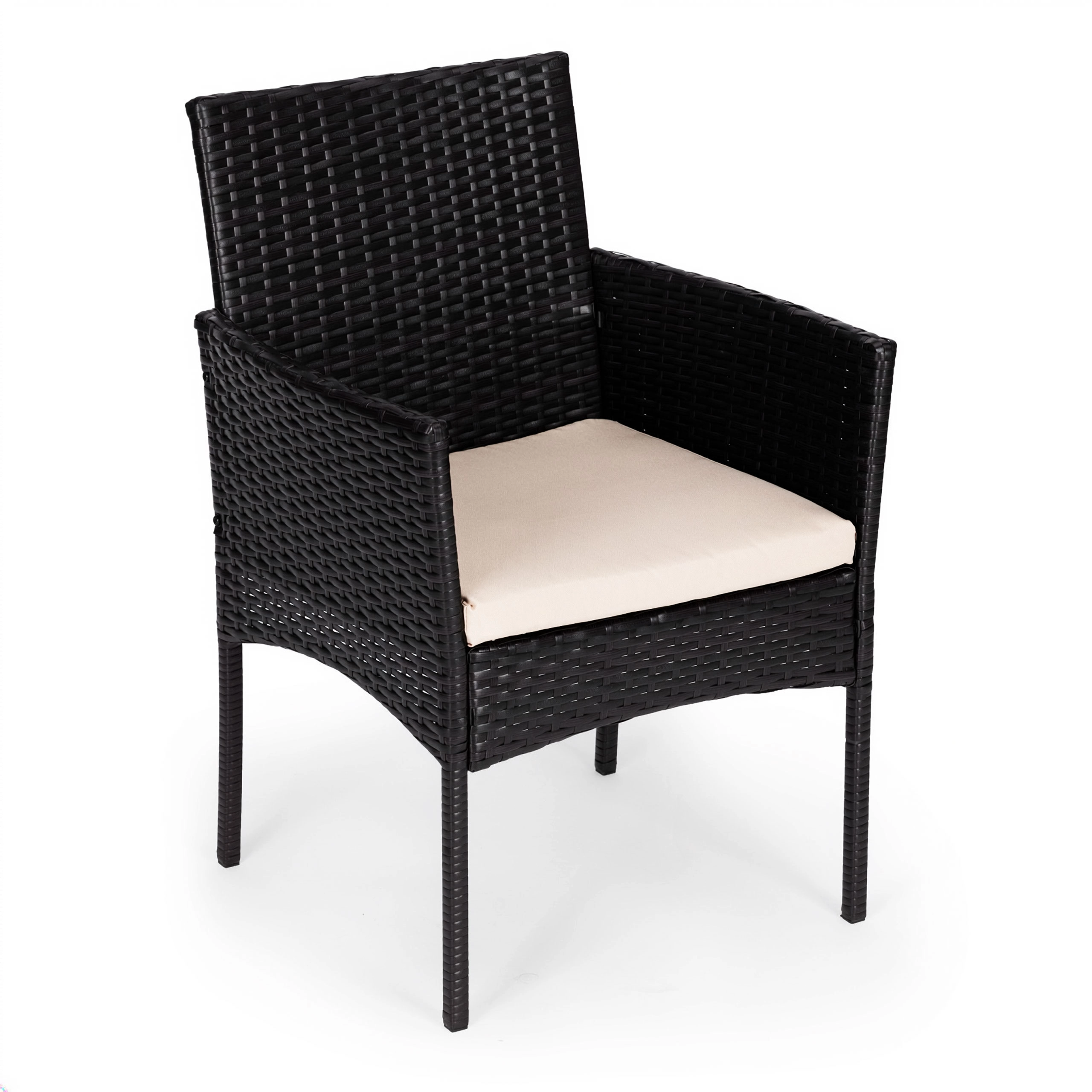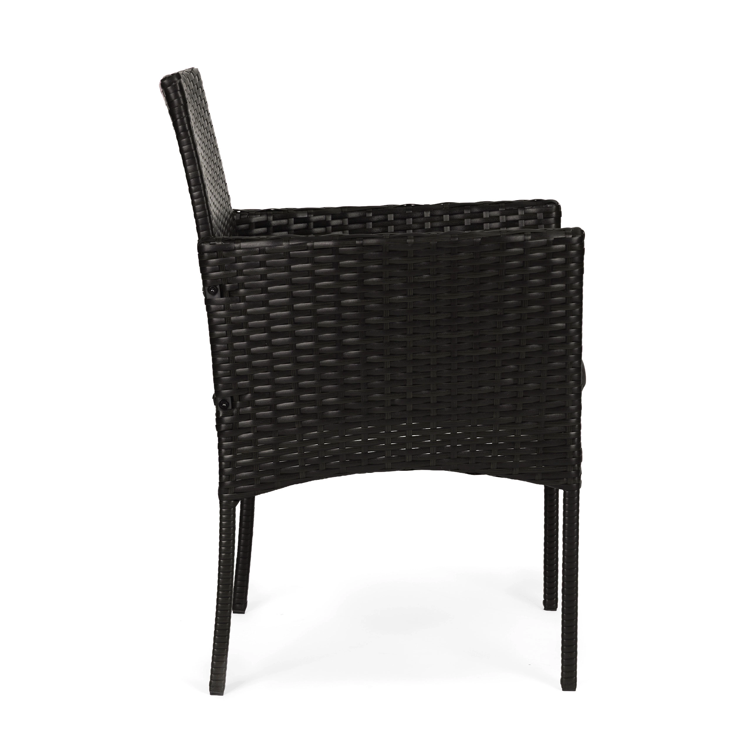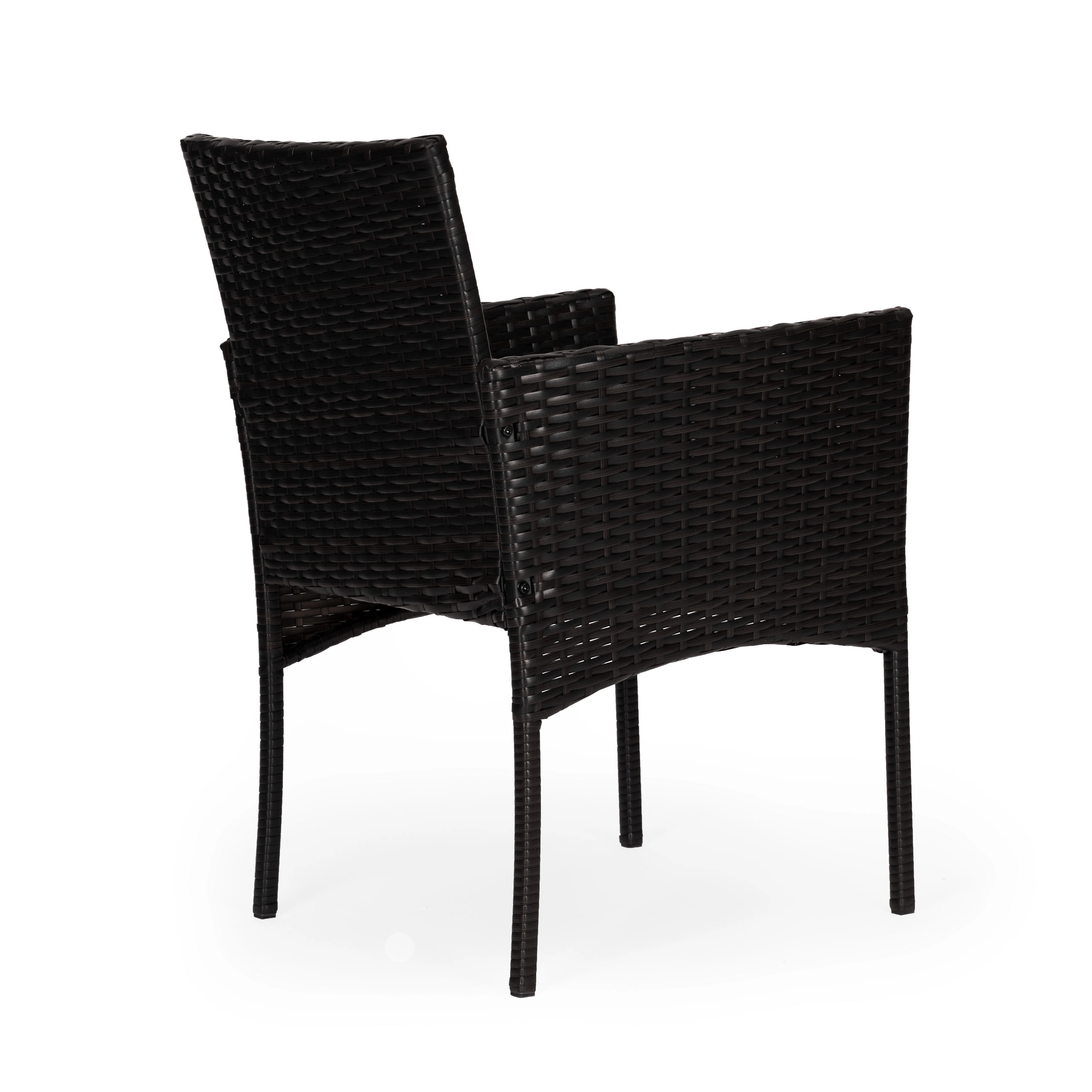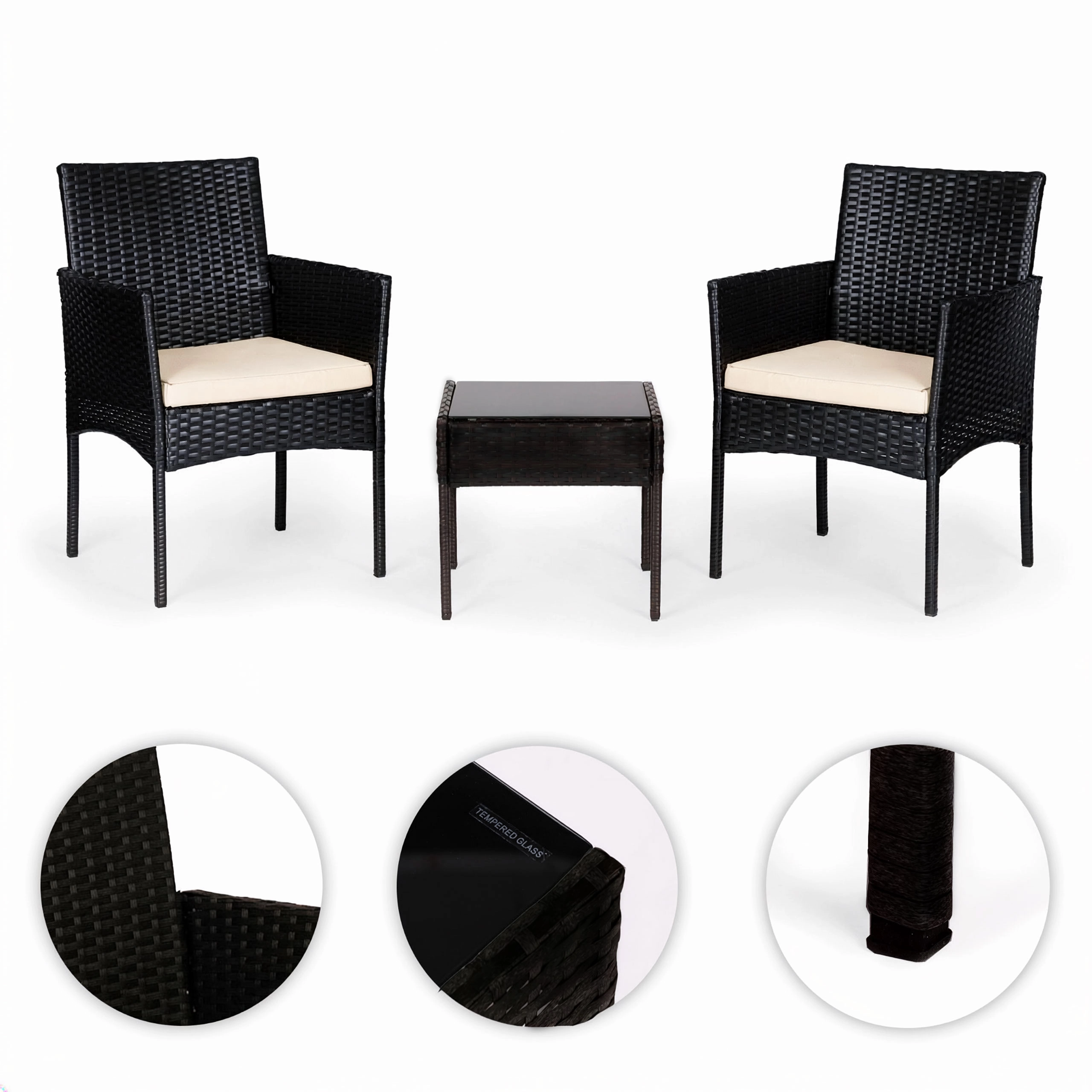 A fotelek strapabíró technorattanból, masszív acélvázzal készülnek. A 160 g/m² poliészter párnák jól bírják a kültéri használatot és kellemes ülőkomfortot biztosítanak. Az asztalt 5 mm vastag edzett üveg teszi biztonságossá a mindennapi használathoz. A lábak csúszásgátló végzárói stabilitást adnak és óvják a padlót.