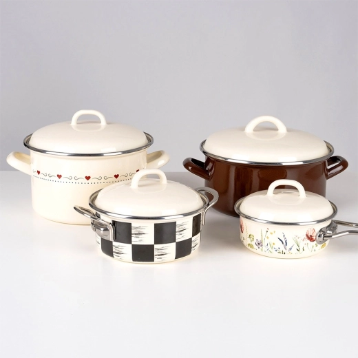 Megjegyzés: A zománcozott edényeken előfordulhatnak apró gyártási egyenetlenségek (pl. enyhe kiemelkedések vagy nem teljesen szimmetrikus minták), amelyek nem befolyásolják a minőséget és a funkcionalitást, és kiemelik a hagyományos gyártási eljárást.
