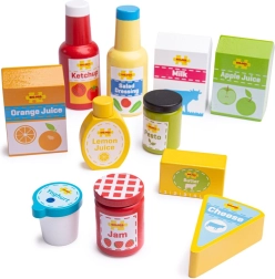 Ez a kidolgozott fa készlet népszerű „tartós” élelmiszerek válogatását tartalmazza – például ketchupot, öntetet, tejet, almalevet, narancs- és citromlevet, lekvárt, vajat, pestót, sajtot és joghurtot. A valósághű formák és színes címkék játékra csábítják a gyerekeket, miközben észrevétlenül segítik az élelmiszerek megismerését és az egészséges táplálkozásról való beszélgetést.