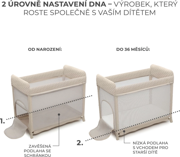 - 2 használati szint – függesztett fekvőfelület újszülötteknek, alsó pozíció totyogóknak.