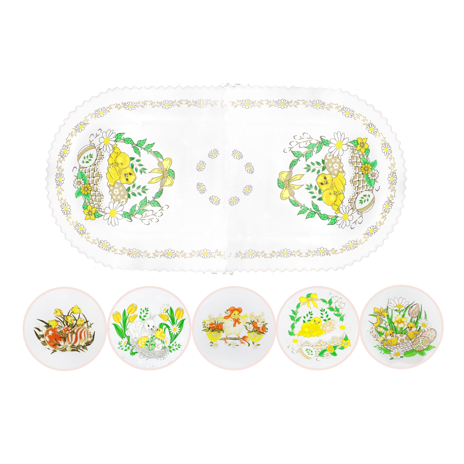 Elegáns szervéta húsvét utáni időszakra, 40 × 80 cm méretben, amely frissességet és tavaszi hangulatot kölcsönöz az asztalnak. Prémium minőségű, 100% poliészterből készült, amely hosszú élettartamot és könnyű karbantartást biztosít, valamint remekül kombinálható más dekorációkkal a semleges krémszínnek köszönhetően.