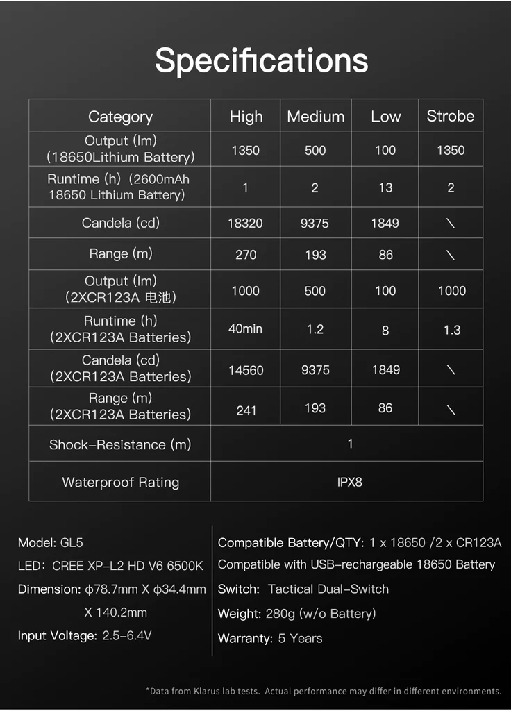 A KLARUS GL5 lámpát igényes taktikai felhasználásra tervezték. A polírozott reflektor és a CREE XP-L2 HD V6 LED éles, hideg fehér 6500 K fénykévét adja nagy fényerővel és hosszú hatótávval. A gumírozott ház ergonomikus markolattal biztos fogást és magabiztos kezelést nyújt még kesztyűben is.