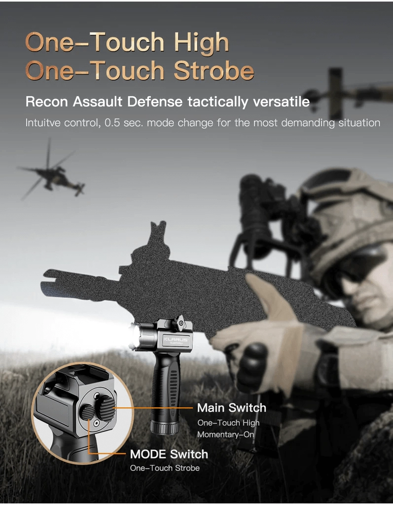 A vezérlést kettős hátsó kapcsoló biztosítja – a kerek MODE gomb közvetlen hozzáférést ad a STROBE módhoz kikapcsolt állapotból is, a hosszúkás fő gomb pedig pillanatfény üzemet kínál. A kialakítás lehetővé teszi a gyors fel-/leszerelést a szabványos 1913 Picatinny sínre, így ideális több fegyver közötti váltáshoz.