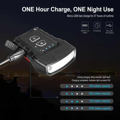 Az integrált Li-ion 3,7 V / 500 mAh akkumulátor USB-n keresztül tölthető, és a választott módtól függően rugalmas üzemidőt kínál. A vezérlés intuitív: egy gomb az üzemmódok váltásához, egy másik gomb az érzékelő aktiválásához. Ideális választás futáshoz, kempingezéshez, túrázáshoz és terepi munkához.