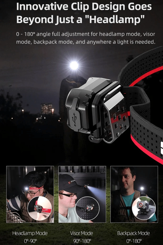 A micro‑USB töltés gyors és kényelmes – a jelzőfény pirosan világít töltés közben, zölden teljes töltöttségnél. Az innovatív csíptető és forgó tartó 0–180°‑os szögállítást tesz lehetővé, így a fényt könnyen az aktuális tevékenységhez igazíthatod a futástól a kempingezésen át a horgászatig. A vezérlés intuitív: egy gomb a módváltáshoz, dupla nyomás aktiválja a piros villogást.
