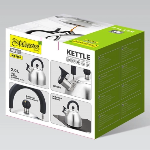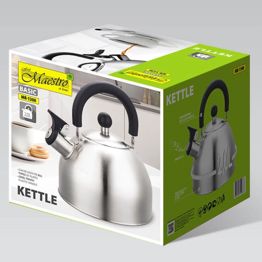 A 2,0 literes, kiváló minőségű rozsdamentes acélból készült MAESTRO gázforraló ideális a mindennapi tea- és kávéfőzéshez. A síp biztonságosan jelzi a forrást, a többrétegű kapszulás fenék gyors és egyenletes melegítést biztosít, a könnyen levehető fedél pedig megkönnyíti a feltöltést és a tisztítást. Minden típusú tűzhelyhez, beleértve az indukciósat is alkalmas.
