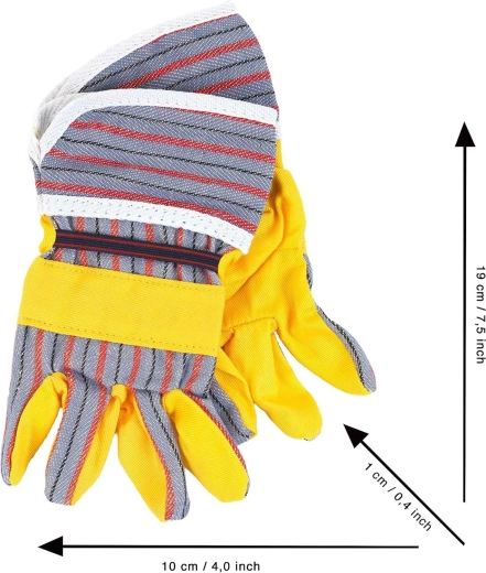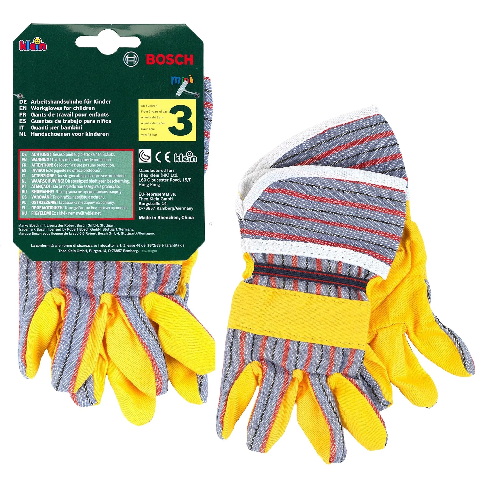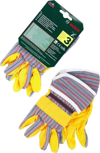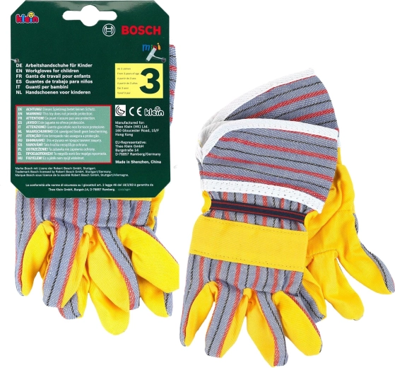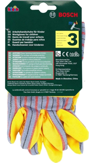 A Klein márkájú BOSCH mini gyerek munkakesztyű remek kiegészítő a kis barkácsolóknak. Élethűen utánozza a valódi kesztyűket, sárga tenyérrésszel és szürke csíkos elemekkel, rugalmas mandzsettával a jobb tartásért, és ideális barkács- és kertészes játékokhoz.