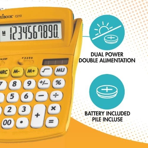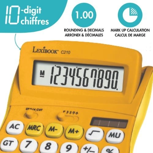 A praktikus LEXIBOOK zsebszámológép élénk sárga színben 10 számjegyű kijelzővel, kényelmes gumis (szilikon) felülettel és kettős tápellátással – elem + napelem rendelkezik. Iskolába és otthonra egyaránt remek választás az olyan funkcióknak köszönhetően, mint a kerekítés 2 tizedesjegyre, árrés számítás és a memóriagombok.