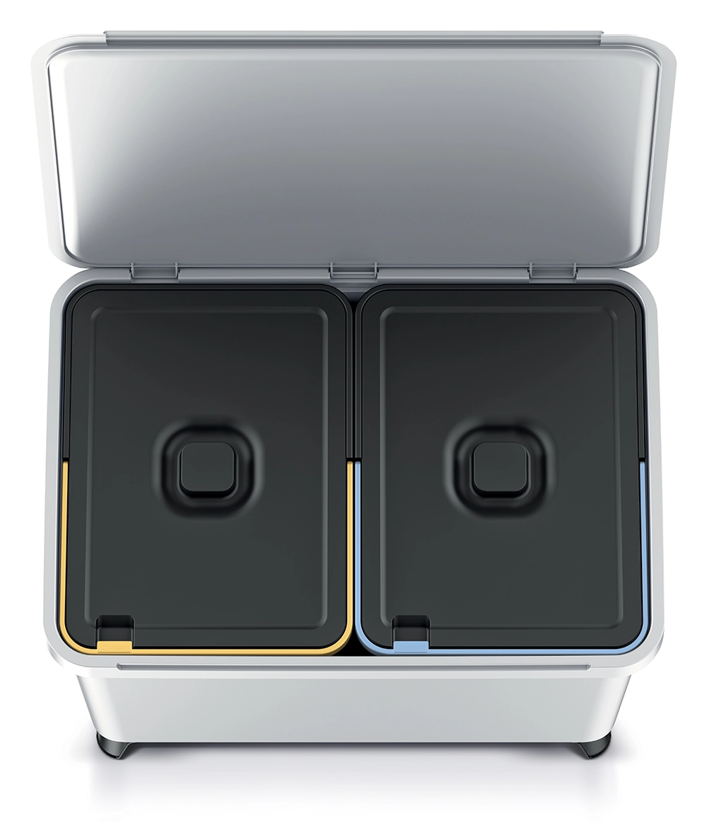 A dupla belső rendszer egyértelműen jelölt fedelekkel felgyorsítja a hulladék szétválogatását, és erőfeszítés nélkül tart rendet.