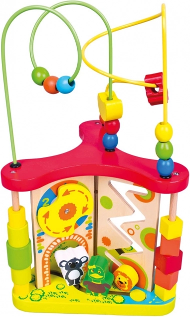 Ez a többfunkciós fa aktivitási labirintus a Bino márkától úgy készült, hogy egyszerre szórakoztassa és fejlessze a gyerekeket. A fémdrótokon futó gyöngyök, a forgó és csúszó elemek, valamint az illusztrált állatmotívumok ösztönzik a kíváncsiságot, a koncentrációt és a szem–kéz koordinációt.