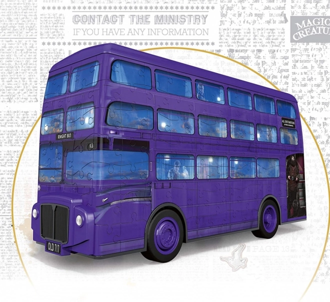 A lila kétszintes busz alakú autóbusz Harry Potter világából inspirálódott karakterekkel az ablakokban és 'MINDEN MEGÁLLÓ' felirattal.