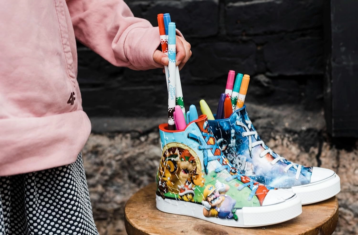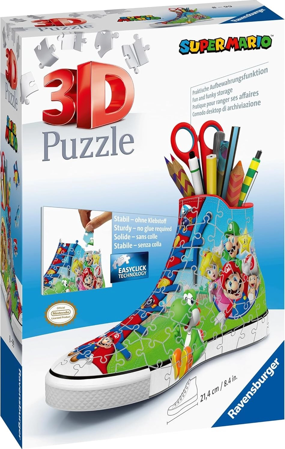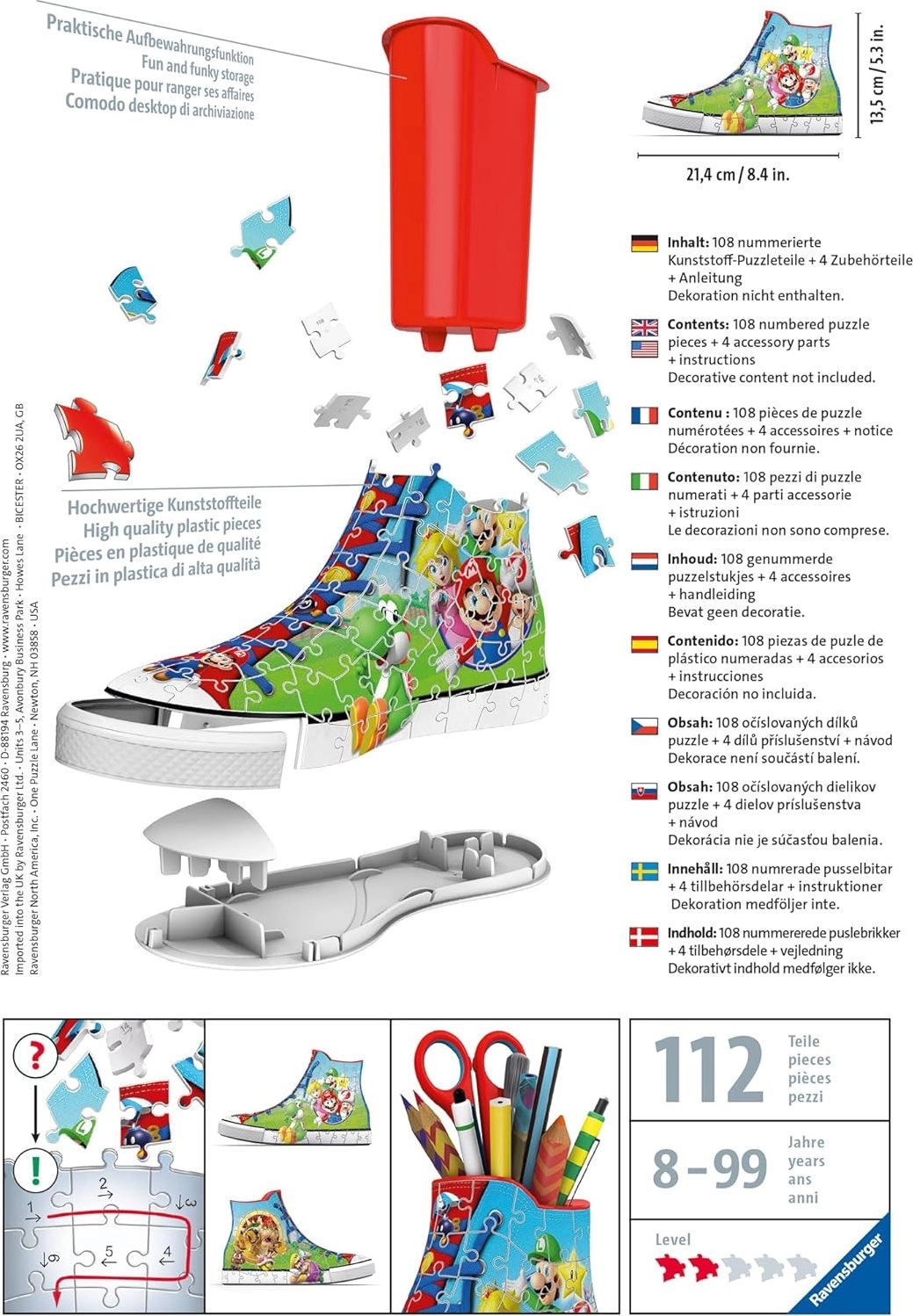 Rakd össze 108 műanyag puzzle darabból ezt a klasszikus tornacipőt Super Mario motívummal, és szerezz tökéletes szobadíszt! Összeállítás után egy további bónusz vár rád: használhatod ecsetekhez, ceruzákhoz stb.