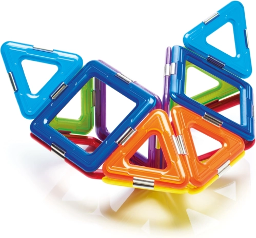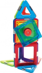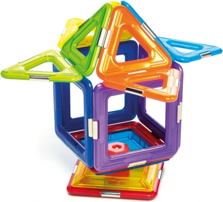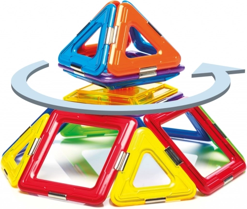 A készlet összesen 6 mágneses négyzetet, 8 háromszöget és 1 pörgettyűt tartalmaz, ami széles teret nyújt a kísérletezéshez. Ez a készlet nemcsak szórakoztató, hanem oktatási célokat is szolgál, és fejleszti a gyermekek készségeit, mint például a térbeli képzeletet, koordinációt, koncentrációt és kreativitást.