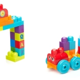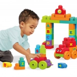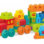 Ez a színes, oktató készlet lehetővé teszi, hogy a három, kerekes alvázat összekapcsolva vonatot építsen, és rájuk A–Z betűs kockákat helyezzen. A gyerekek játékos formában tanulják az ábécét, alkotják meg első szavaikat, és gyakorolják a kéz–szem koordinációt.