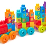 Minden kockán egy betű található, így a gyerekek a vonaton rakhatják ki az ábécét és első szavaikat.