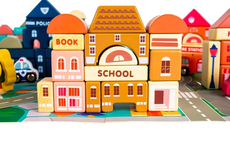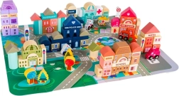 Ezek a fából készült városi építőkockák számtalan órányi izgalmas játékélményt nyújtanak a gyermekeknek. A készlet nagy méretű, tartalmaz 115 különféle kockát és 20 puzzle darabot, amely az utcák megjelenítésére szolgálnak. A kockák segítségével különböző lakó- és középületek, valamint járművek, fák, táblák és lámpaoszlopok építhetők fel, így a játék mindig leköti a gyerekek figyelmét.