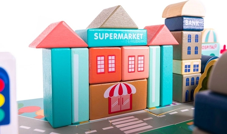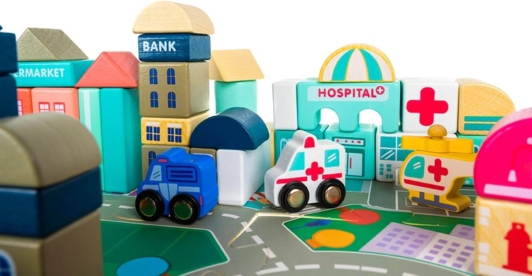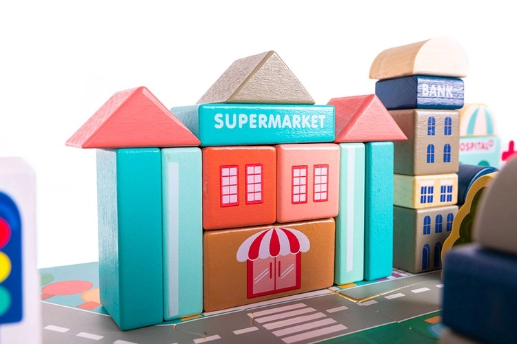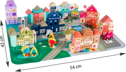 Fából készült városi építőkockák, amelyek kreatív, szórakoztató és fejlesztő játékélményt nyújtanak. Tökéletes unaloműző és tanulást segítő eszköz.