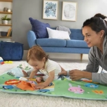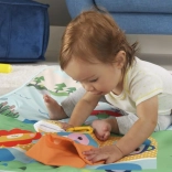 A kb. 152 × 81 cm-es szőnyeg elegendő helyet biztosít a guruláshoz, hasidőhöz és a közös játékhoz a szülőkkel. A színes kemping minta serkenti a fantáziát és a felfedezést.