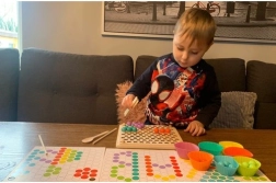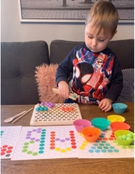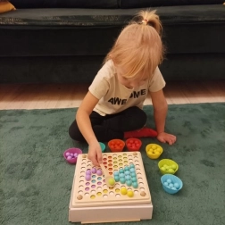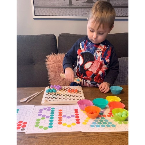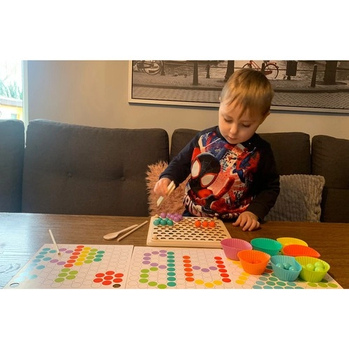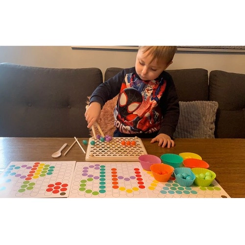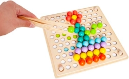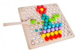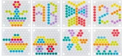 - Csomag tartalma: gyöngyök behelyezésére szolgáló tábla, gyöngykosarak, gyöngyök (7 színben), kanál, csipesz, pálcikák, képkártyák
