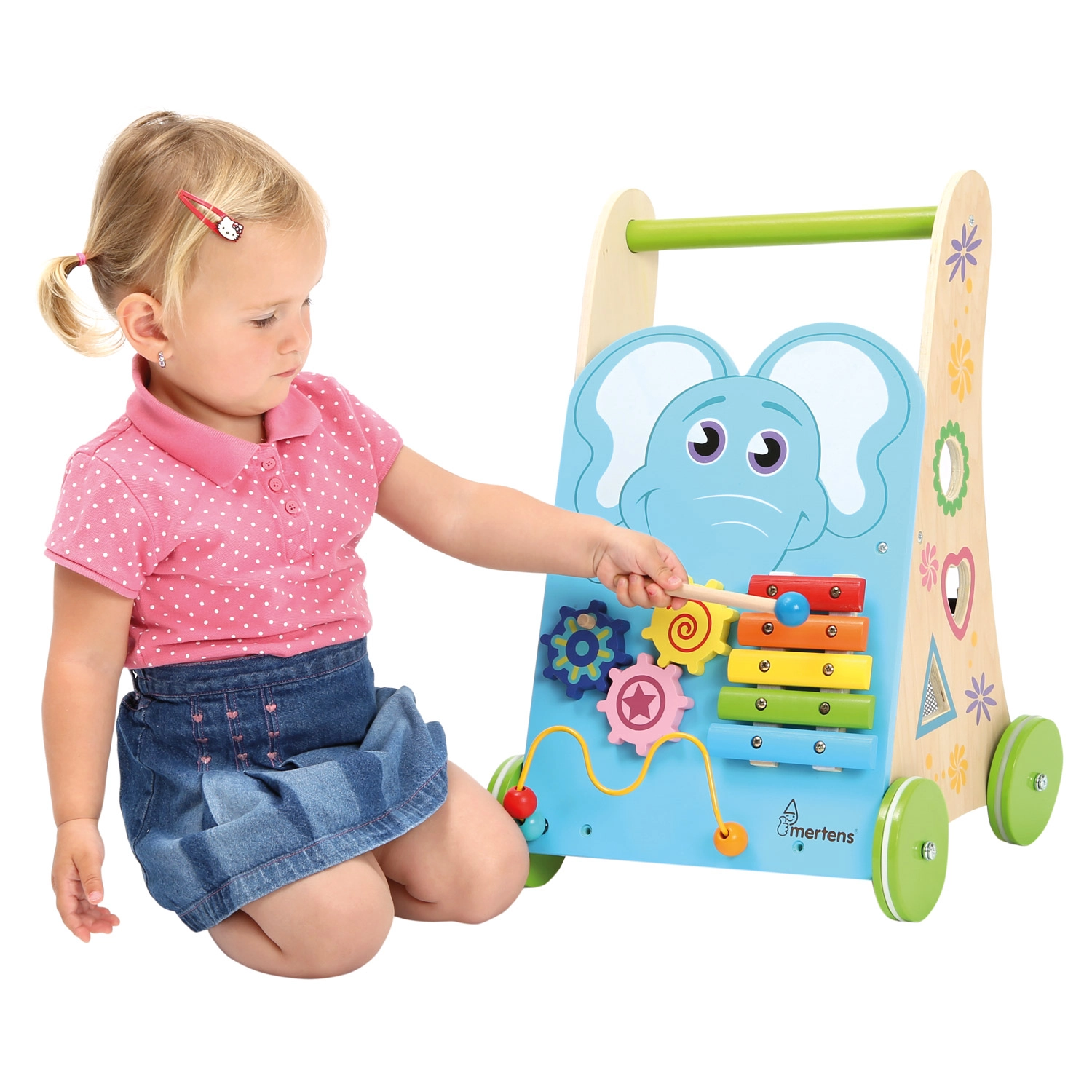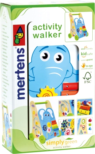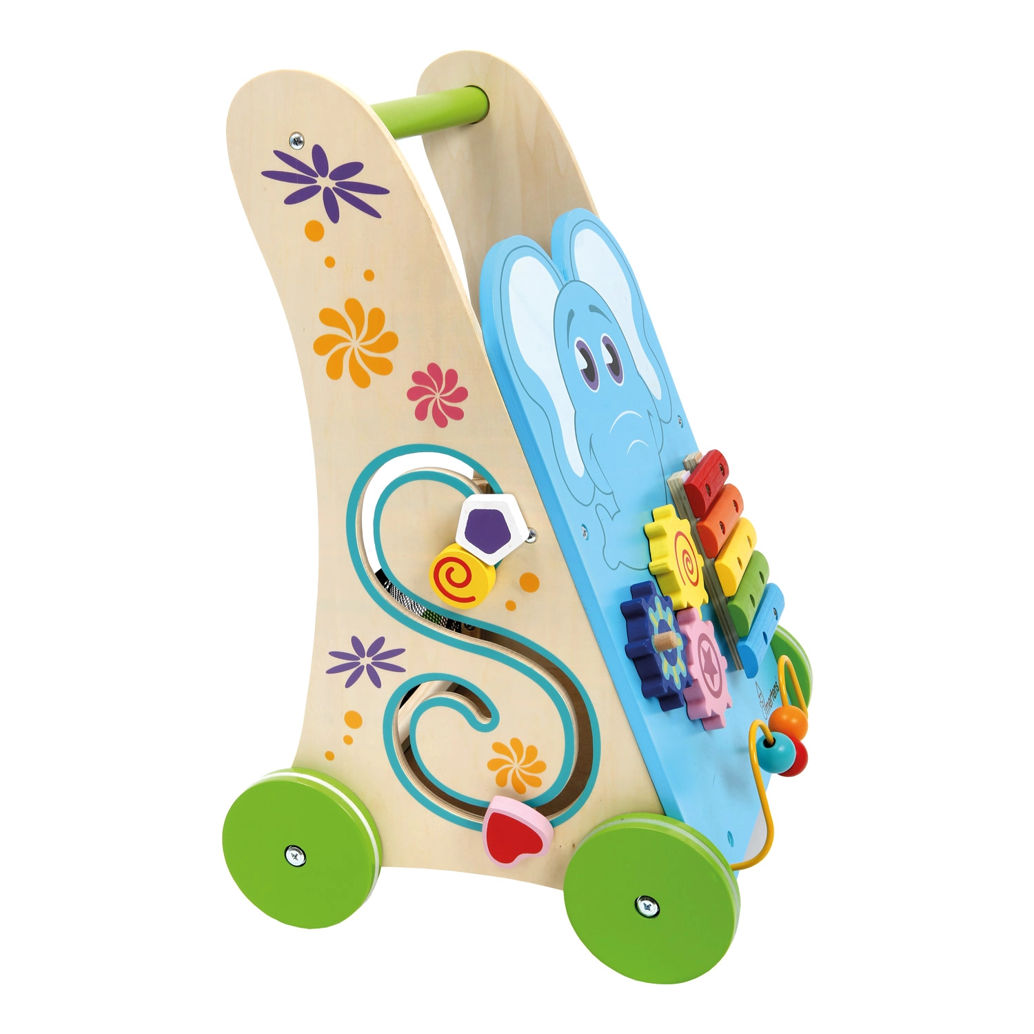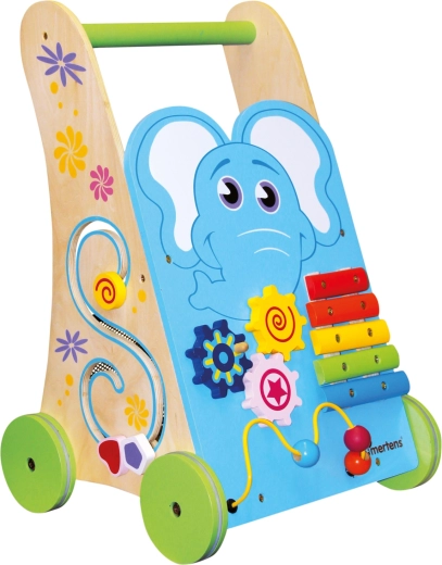 Támogasd kisgyermeked első lépéseit és sokoldalú fejlődését ezzel a stabil, tevékenységekkel ellátott fa járássegítővel. Tartalmaz egy lágy hangzású xilofont, gyöngy labirintust, formabedobót és fogaskerekeket az ok-okozati összefüggések felfedezéséhez. A gumírozott kerekek csendes futást és padlóvédelemet biztosítanak, a 100% FSC fa felhasználásával készült masszív felépítés biztonságos és tartós.