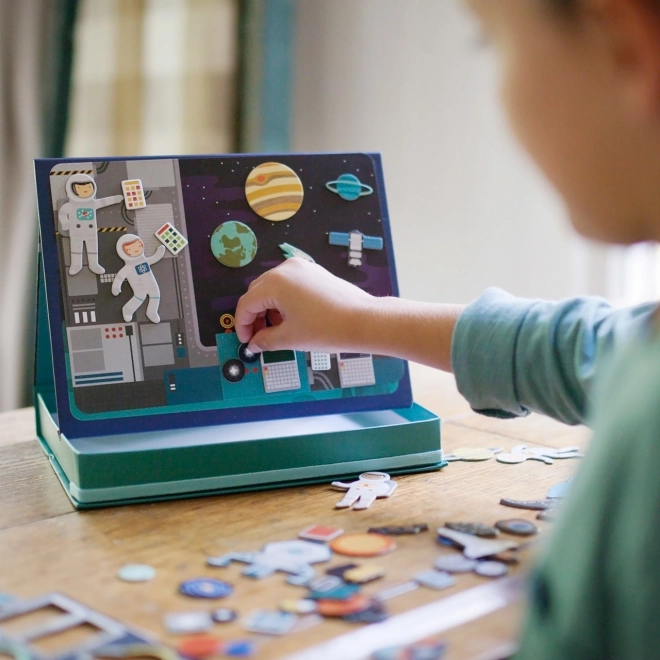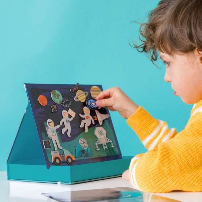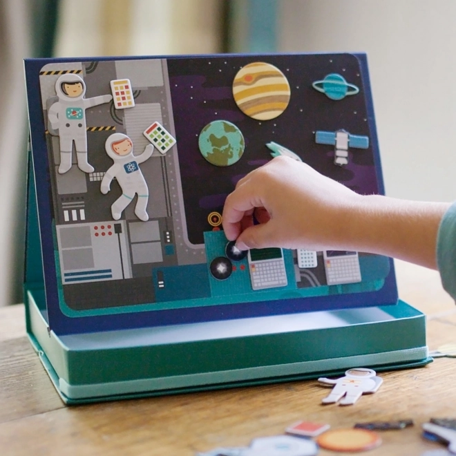 A Mágneses űrszínház végtelen kombinációt és jelenetet kínál két mágneses háttéren – a világűrben és az űrállomáson. A több mint 50 mágneses elemmel a kis felfedezők egyedi történeteket alkothatnak, fejleszthetik fantáziájukat és finommotorikájukat. A praktikus, állvánnyal és ütközőkkel ellátott doboz bárhol egyszerűvé teszi a színpad felállítását.