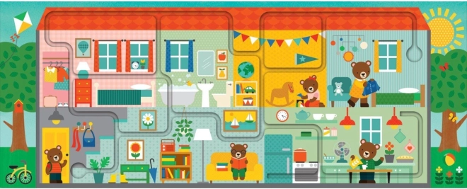 A puzzle összeállítása után a gyerekek ujjukkal követik az útvonalat a házikón keresztül, fejlesztve a koordinációt és a koncentrációt.