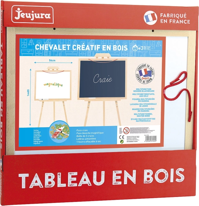 A Jeujura fa állvány multifunkciós táblával univerzális felületet kínál rajzoláshoz és íráshoz. A kétoldalas tábla krétához és filchez egyaránt alkalmas, így sokoldalúan használható játékhoz és tanuláshoz. A fa állvány tárolópolccal rendelkezik, ahová a gyerekek elhelyezhetik szükséges eszközeiket. A csomag tartalmaz három krétát, egy filcet és egy készlet mágneses betűt.