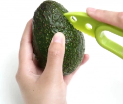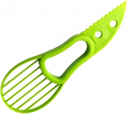 Fedezze fel, milyen egyszerű pár másodperc alatt avokádót készíteni. Ez a multifunkciós segédeszköz ötvözi a éles műanyag kést a hosszanti vágáshoz, a speciális részt a mag biztonságos eltávolításához, valamint a praktikus oldalt a hús gyors kiemeléséhez és szeleteléséhez.