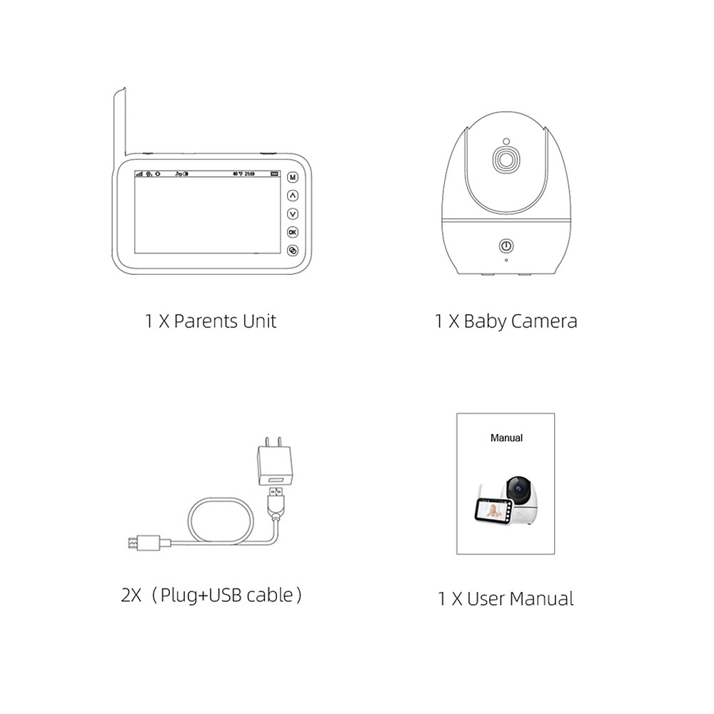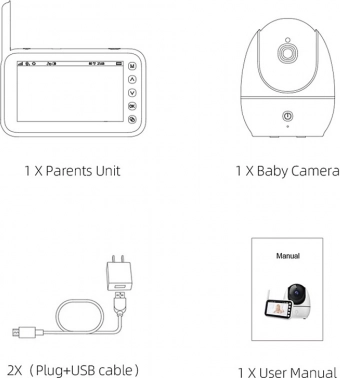 - Kamera, szülői egység kijelzővel, hálózati adapter, USB kábel