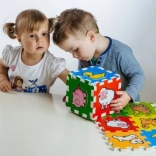 Minden puzzle-darab vidám állatképekkel díszített, amelyek segítik a gyerekeket a színek és formák felismerésében.