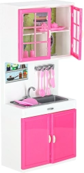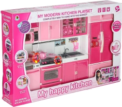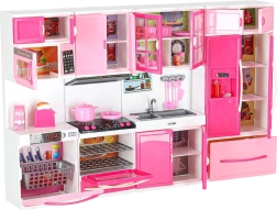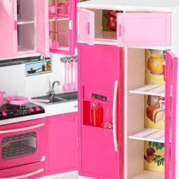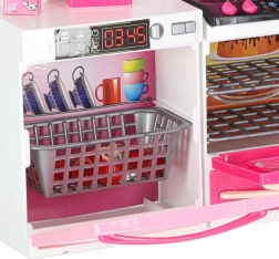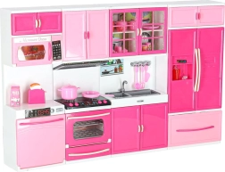 Stílusos rózsaszín-fehér babakonyha négy modulból, LED-megvilágítású égőkkel és hangeffektekkel. Nyitható ajtók, mikrohullámú sütő, sütő, mosogatógép, hűtő és mosogató, valamint gazdag tartozékkészlet a realista főzős szerepjátékhoz és a konyha rendszerezéséhez.