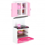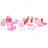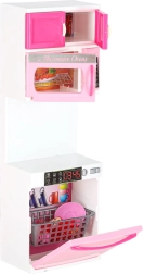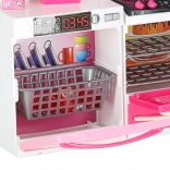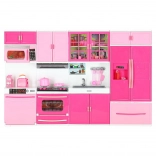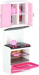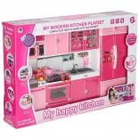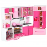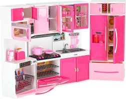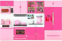 A készlet tartalmaz mikrohullámú sütőt és mosogatógépet, tűzhelyet sütővel, vitrint mosogatóval, valamint fiókos hűtőt. A gyerekek teljes főzés-, sütés- és takarítási jeleneteket játszhatnak el.