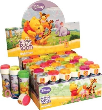 Micimackó mintás buborékfújó, 60 ml tartalommal. A színes kupak része egy játék és egy fúvóka. Megvásárolható teljes displayként is, 36 darabbal.