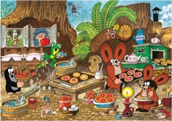 Vidám illusztráció Kisvakonddal és barátaival a konyhában, tele apró részletekkel, amelyek szórakoztatják a gyerekeket és fejlesztik a fantáziát.