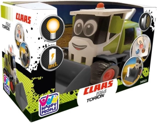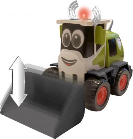 Ez a bájos, zöld színű CLAAS Mini rakodó fekete kerekekkel és piros részletekkel a legkisebbeket is lenyűgözi élethű funkcióival. Gombnyomásra motorhang hallatszik és felgyulladnak a figyelmeztető fények. A kézzel vezérelhető kanál megkönnyíti az emelést és süllyesztést, fejlesztve a finommotorikát.