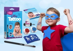 A nagyobb készletek több eszközt tartalmaznak: Mozgó szemek/öntapadós kövecskék: a kész mintát tovább díszítheted. Vigyél fel egy kis mennyiségű ragasztót az öntapadós kövecskékre, majd nyomd a bőrre.