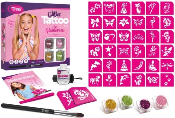 Fedezd fel a kreatív szórakozást a TyToo Glamorous nagy csillámtetoválás készlettel. 36 népszerű lányos mintát és 4 csillám színt kínál végtelen kombinációkhoz. A tetoválás vízálló, a bőrön általában 8–18 napig tart, és könnyen eltávolítható alkohollal vagy babolajjal. A szett része ö ragasztós strassz és mozgó szemek az igazán egyedi díszítéshez.