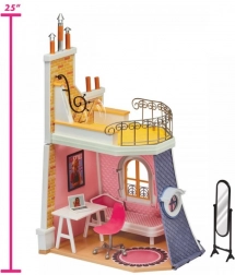 A babaház kétszintes teret biztosít kis figurákkal és dekorációkkal, mint az ágy, asztal és tükör. A fantáziadús játék szórakozása garantált.