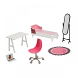 A babaház belső tere rózsaszín-fehér színpalettával tartalmaz íróasztalt laptoppal, rózsaszín forgószékkel és ágyat asztallal. Az erkély és a tükör valósághű érintéseket adnak hozzá.