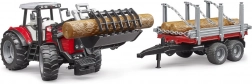 A rönkszállító nyitható oldalfalakkal és billenőplatóval rendelkezik, így a rakomány kezelése intuitív és szórakoztató. A traktor vonóberendezése magasságban állítható, a pótkocsi pedig más BRUDER traktorokhoz is csatlakoztatható. A minőségi műanyag kivitel hosszú élettartamot és biztonságos játékot garantál.
