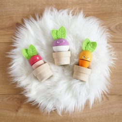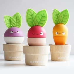 - 3 fa virágcserép, cserélhető részekkel ellátott zöldségek (sárgarépa, retek, cékla) filc levelekkel