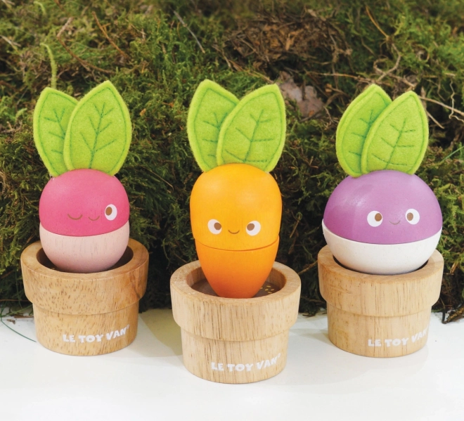 - 3 aranyos zöldség: sárgarépa, retek, cékla – mindegyik fa virágcserépben