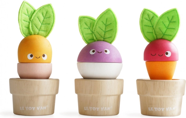 A LE TOY VAN bájos fa virágcserép-készlete zöldségekkel fejleszti a finommotorikát, a kéz–szem koordinációt és a képzelőerőt. A gyerekek keverhetik és összeilleszthetik az egyes elemeket sárgarépává, retkévé és céklává, vagy saját kombinációkat alkothatnak. A játék fenntartható fából készül, filc levelekkel rendelkezik, és kézzel utánfestett, vízbázisú, nem mérgező festékekkel.