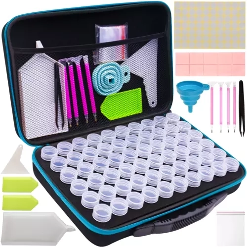 Ez a praktikus készlet megkönnyíti minden gyémántfestés-rajongónak a rendszerezést és magát az alkotást is. Minden biztonságosan helyet kap a masszív, strapabíró, cipzárral ellátott tokban, beleértve a habbetétben áttekinthetően elrendezett üvegcséket és a kiegészítőknek szánt hálós zsebet. Ennek köszönhetően minden kő és eszköz mindig kéznél van és tökéletesen szétválogatva.
