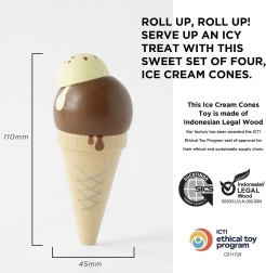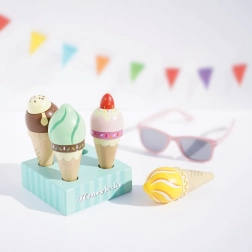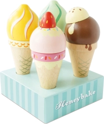 A Le Toy Van HONEYBAKE fa fagylaltkészlete bármely gyerekszobát kis fagyizóvá varázsol. Négy, különféle díszítésű gombóc természetes tölcsérben, kézzel festve, vízbázisú, környezetbarát festékekkel, ízléses állványon az áttekinthető kihelyezésért.