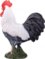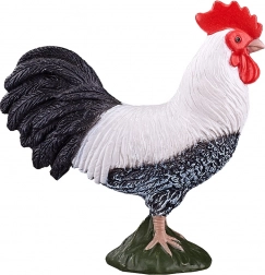 Hűen formázott tollazat, kontrasztos fekete-fehér színezés és piros taréj a kakas autentikus megjelenéséért.