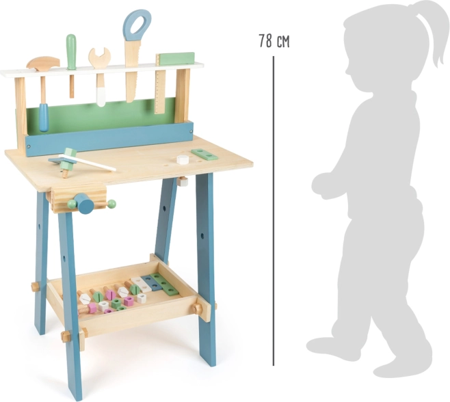 Stílusos, skandináv dizájnú fa munkapad a small foottól, amely fejleszti a gyerekek kézügyességét és fantáziáját. 24 kiegészítőt és stabil, 54 cm magas munkafelületet tartalmaz. Finom pasztellszíneivel és természetes fájával remekül illik bármelyik enteriőrbe. Ideális a finommotorika fejlesztésére, a kreatív játékra és az első ismerkedéshez a szerszámokkal.