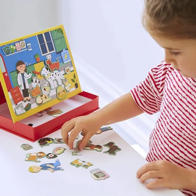 Tökéletes játékot keres kis állatbarátoknak? Mágneses játék: Állatorvosi klinika az ideális választás! Ez a játék két mágneses táblát és 50 mágneses darabot tartalmaz, amelyek lehetővé teszik, hogy a gyerekek saját történeteket és jeleneteket hozzanak létre. A praktikus, hajtogatható doboz megkönnyíti a darabok tárolását és gyors elpakolását.